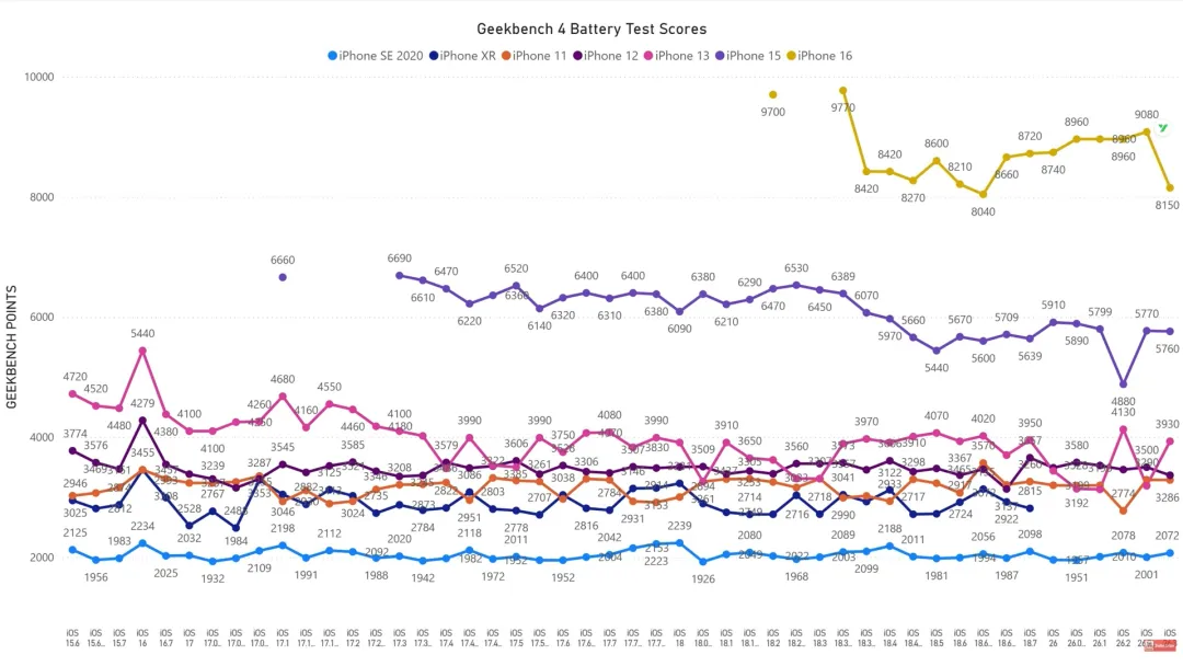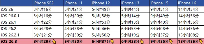 其中,iPhone 11、13 和 15 的电池续航均处于正常状态。尤其是 iPhone 13,续航表现整体回升了 1 个小时左右。而 iPhone 12 和 iPhone 16 在升级 iOS 26.3 后,续航表现出现了明显下降。整体来看,对于大部分参与测试的设备来说,iOS 26.3 都算是一个不错的系统版本。但对于 iPhone 16 机型来说,如果你更在意设备的续航表现。当然需要注意的是,本次续航测试仅用于衡量设备的续航极限。大家可以通过点开大图,了解自己设备的具体情况。