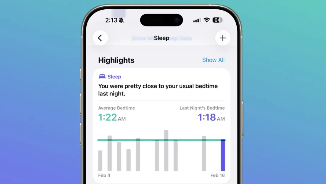 健康应用里新增了“平均就寝时间”指标,可以更直观看到入睡时间与睡眠质量之间的关系;