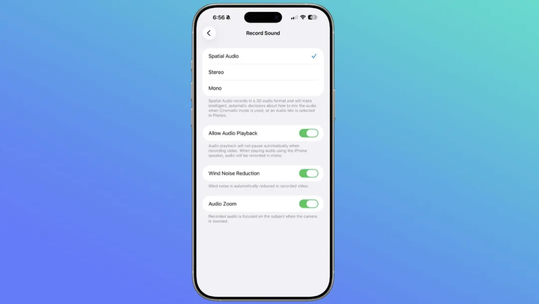相机设置里多了“音频变焦”开关,录视频时如果拉近画面,声音也会更集中在拍摄对象上,可以按需开启或关闭。