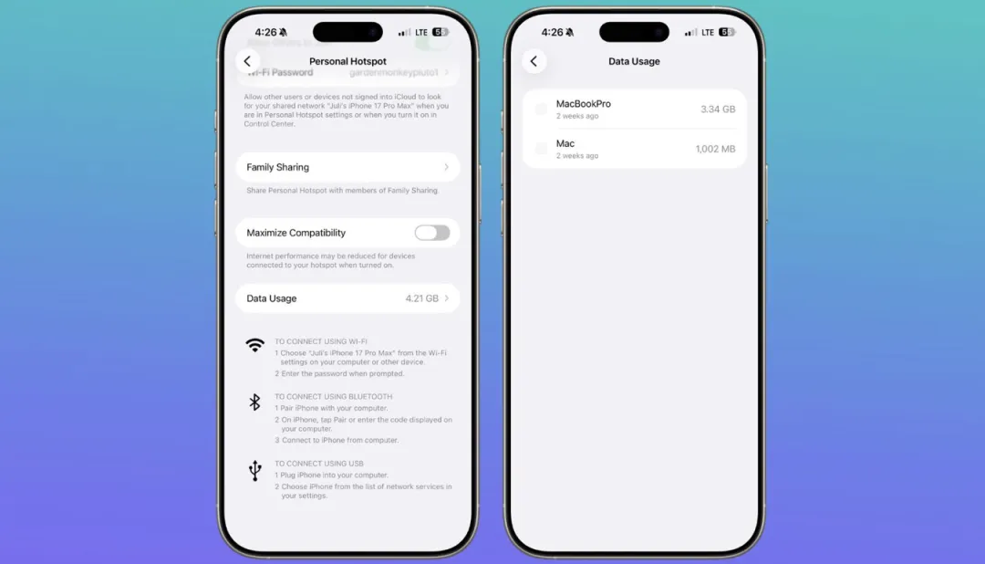 个人热点的数据用量被移到“个人热点”页面下,查看更直接,不必再翻到蜂窝网络里查找。