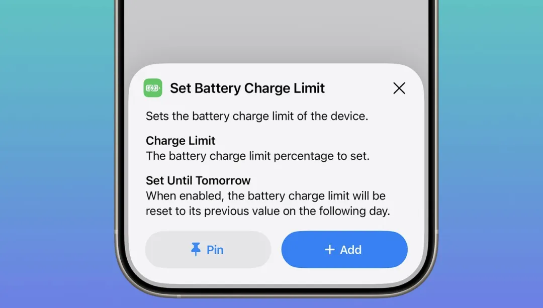 快捷指令则新增“设置充电上限”动作,可以直接通过自动化控制 iPhone 的电池充电限制。