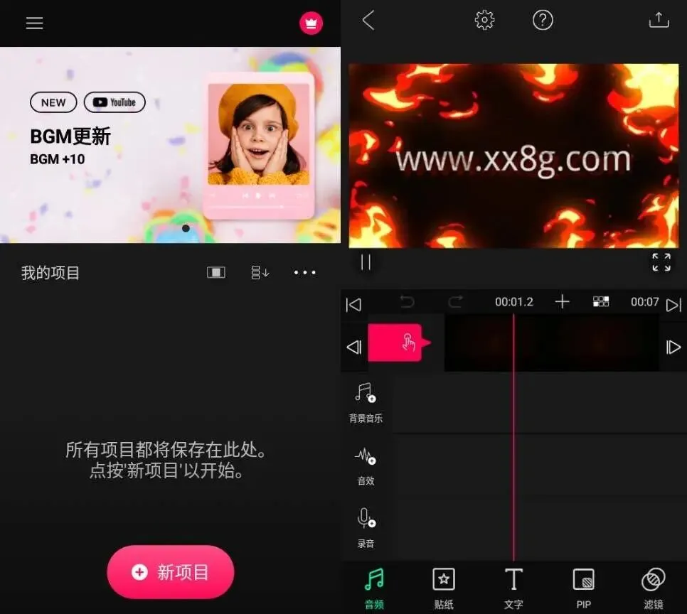 1. 背景音乐与音效:内置1800+款版权-free背景音乐与音效,涵盖流行、抒情、欢快、悲伤、商务、搞笑等多种风格,每月定期更新,解锁了所有付费音频资源,无需担心版权问题,可放心用于视频创作与发布。背景音乐支持音量调节、裁剪、循环播放,可根据视频时长,精准裁剪背景音乐,让音频与视频完美适配;音效支持一键添加,包括掌声、笑声、雨声、风声、转场音效等,可增强视频的临场感与趣味性,让视频更具感染力。此外,支持自定义导入音频,可将手机本地的音乐、录音导入作为背景音乐或音效使用,满足个性化创作需求。