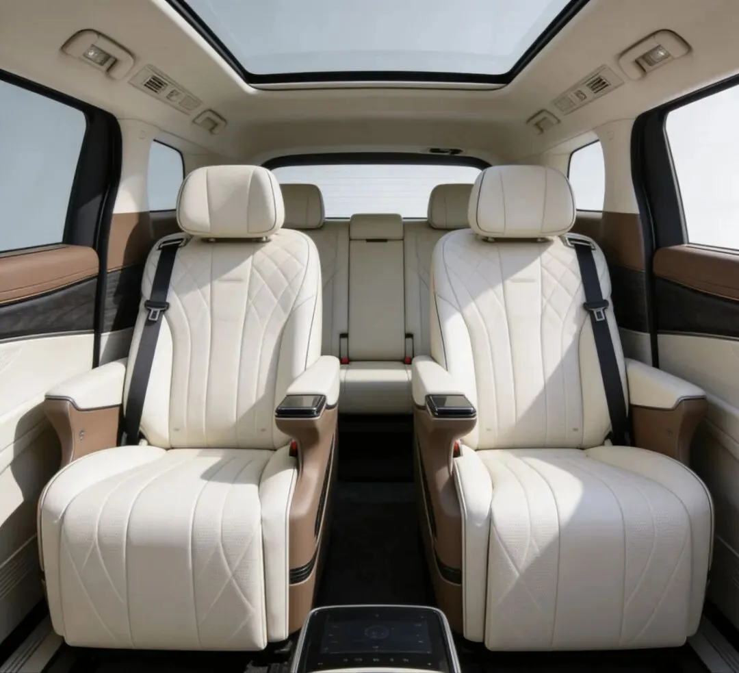 这车在座位上,考虑得很周全,有四座的,也有七座的,四座版本,是私享定制的,里面是航空级座椅,零重力设计,可以加热,可以通风,还可以按摩,各种多向调节,腿托脚踏都有,就是陆地头等舱,坐飞机头等舱,也就这样了,而七座版本,考虑更多,是给家庭用的,二排座椅,能滑动1.2米,这空间就大了,三排空间,设计得也合理,放安全座椅,也没问题,满足家庭出行,带孩子出门,都很方便,很多人看完,都觉得,这车真是,想到了方方面面,兼顾了所有人的需求。