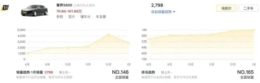 自上市以来,鸿蒙智行尊界S800始终保持超高热度,作为一款售价超70万元的大型豪华轿车,其月销量稳定突破千台,实力稳居细分市场前列。