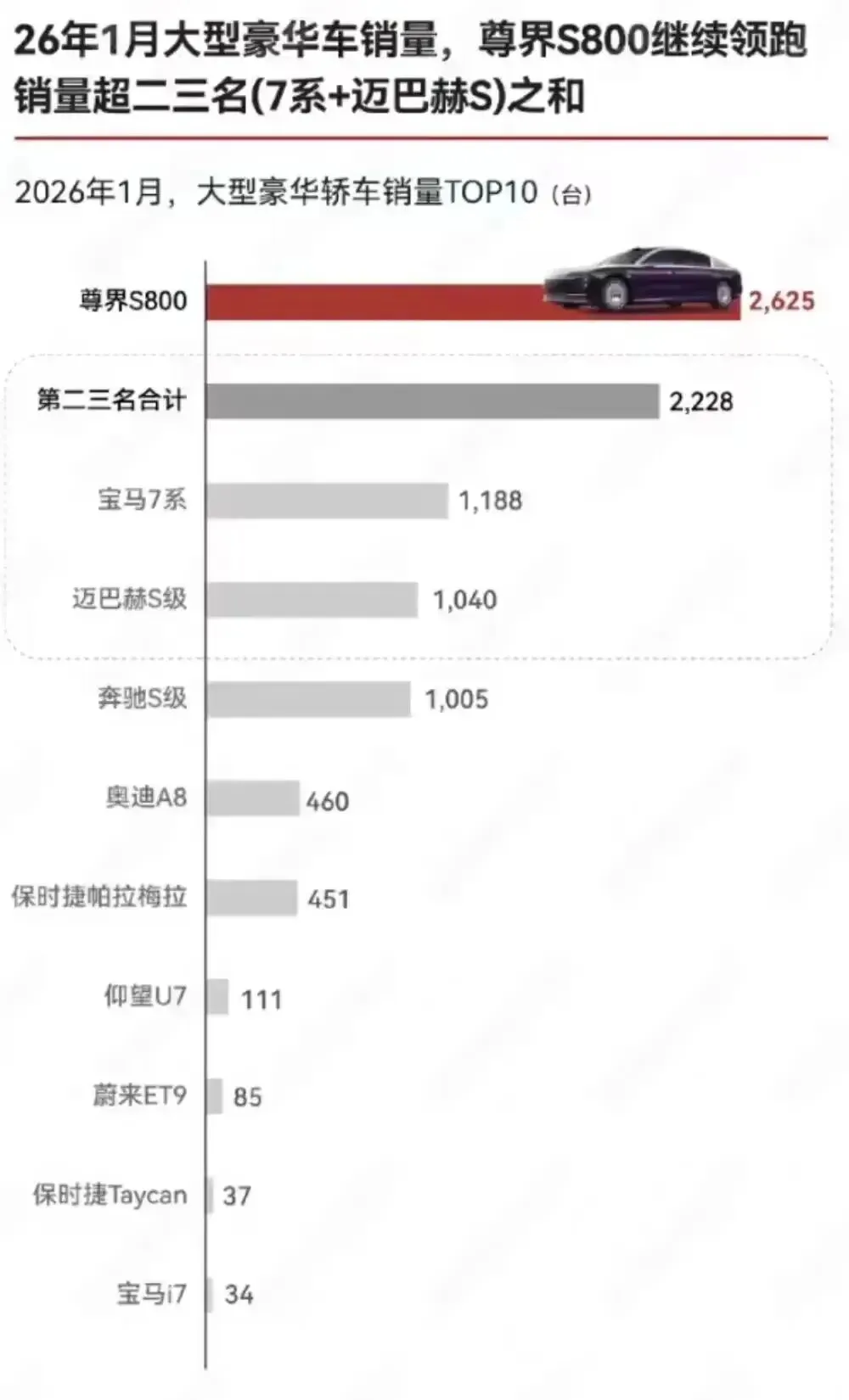 最新数据显示,2026年1月尊界S800销量达2798辆,蝉联大型豪华轿车销量榜首。据博主@新渠道李霸天透露,该销量远超宝马7系与迈巴赫S级的销量总和,深圳、广州、上海成为这款旗舰轿车最畅销的三大城市。