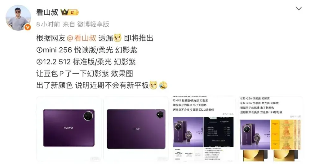 华为平板没有推出全新机型,而是带来了颜值升级,将为两款热门平板推出全新“幻影紫”配色,外观更具辨识度,满足用户的个性化审美需求。