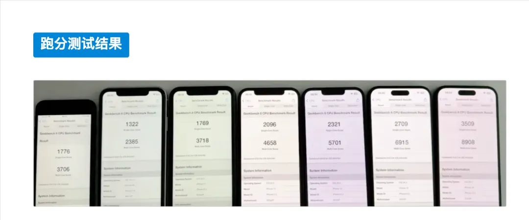 这次测试涵盖了从 iPhone SE2 到 iPhone 16 的 7 款机型,跨越了 A12 到 A18 七代芯片。