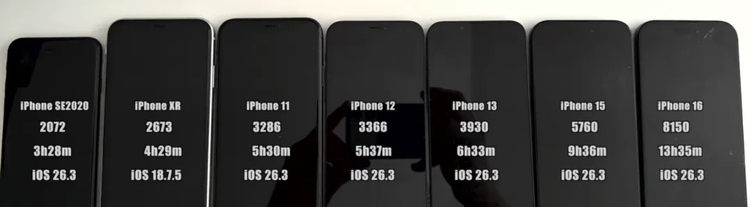 再看两台老机型,iPhone 11和iPhone SE2的波动很小,iPhone 11续航几乎不变,依旧在5小时30分钟一带,跑分维持原水平,iPhone SE2多了7分钟,幅度不大但它电池小,能不掉就是好消息,升级还能顺手把系统里的37个安全漏洞补掉。