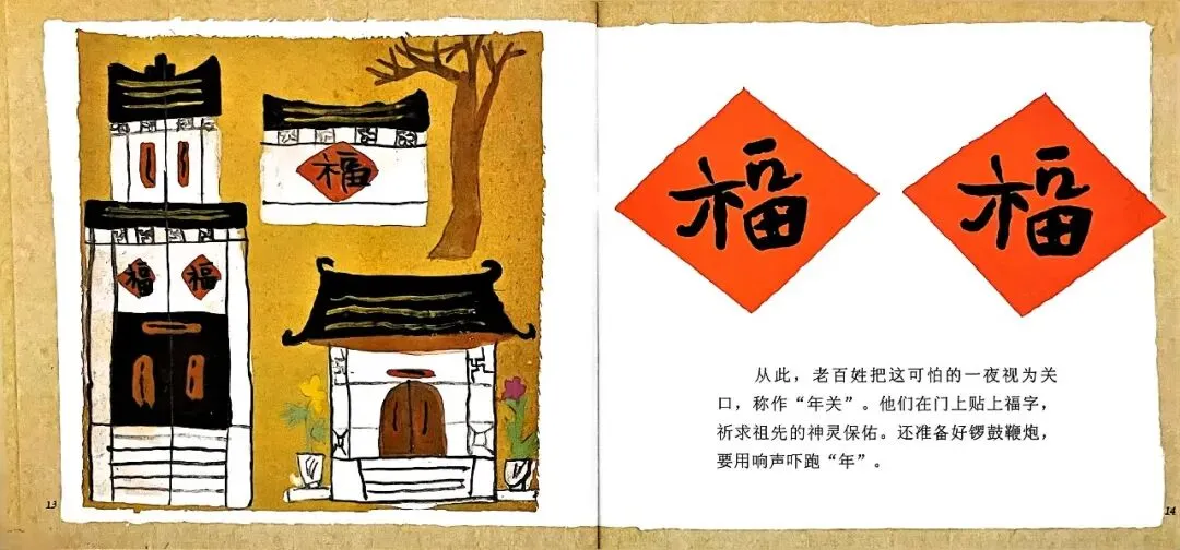 从此,老百姓把这可怕的一夜视为关口,称作“年关”。他们在门上贴上福字,祈求祖先的神灵保佑。还准备好锣鼓鞭炮,要用响声吓跑“年”。