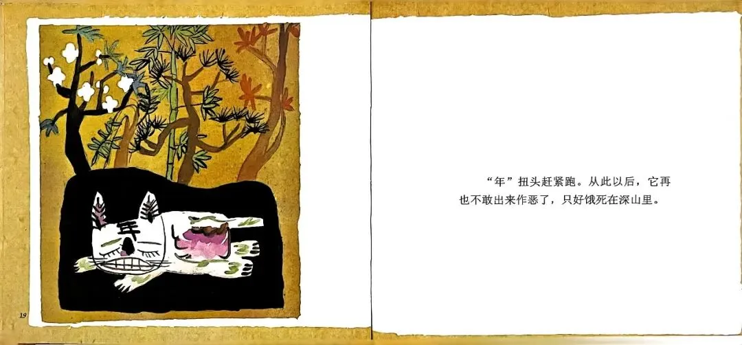 “年”扭头赶紧跑。从此以后,它再也不敢出来作恶了,只好饿死在深山里。