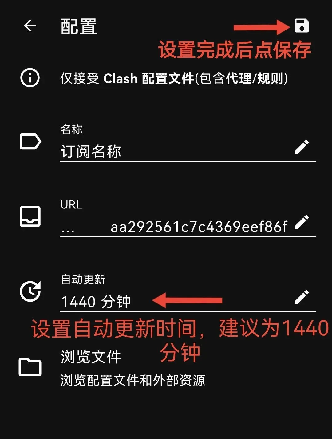 网站面板点击“复制订阅地址”,打开Clash,点“配置” -> 右上角“+”号 -> “URL” -> 点“URL” -> 粘贴、确认 -> 点右上角“保存”图标。