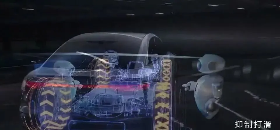 “华为途灵平台,六合一全域融合架构,零毫秒级速度分配四轮扭矩,抑制打滑,防止打滑现象。”