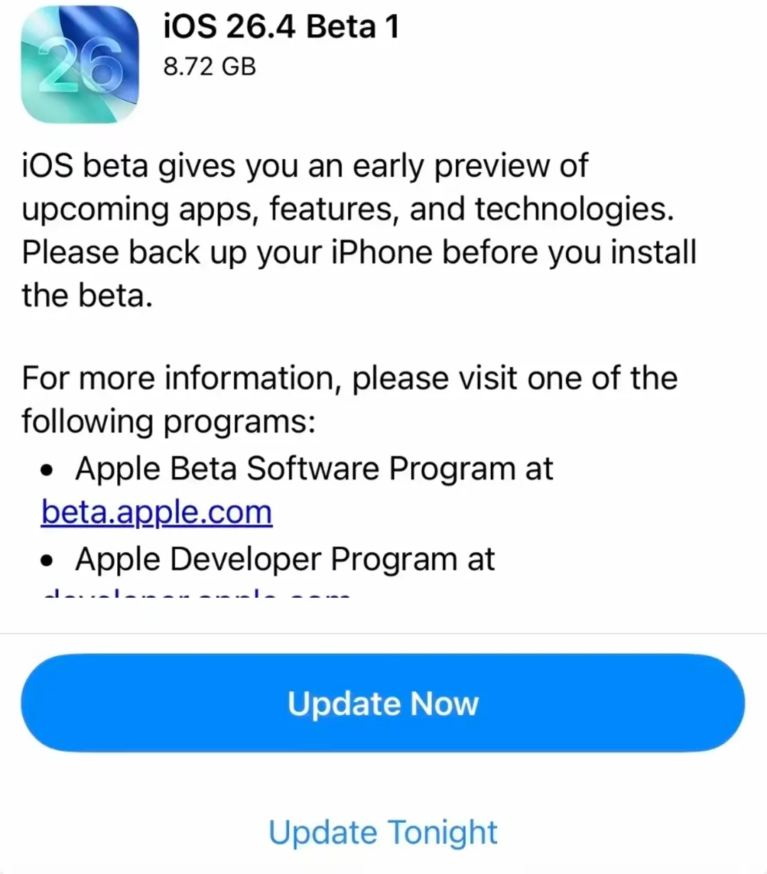 就在咱们还沉浸在春节假期余韵的时候,苹果悄悄在今天凌晨推送了 iOS 26.4 的首个开发者预览版。