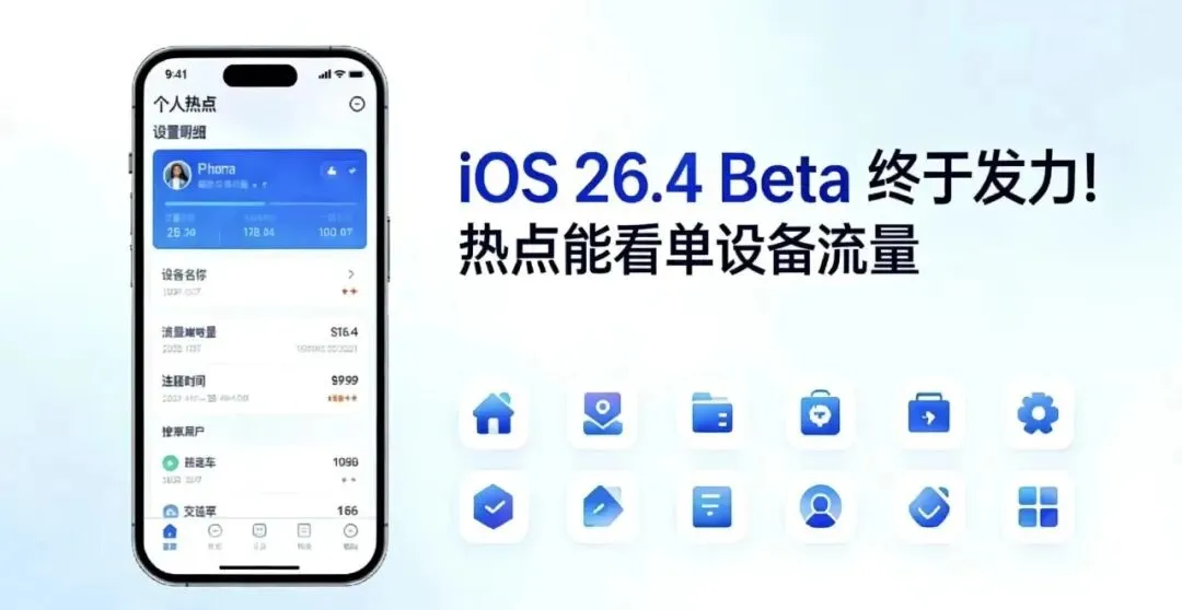 吐槽了好多年,iPhone 个人热点管不住流量这事,总算有个头了,新年的第一天,2 月 17 日凌晨,参与测试的设备收到iOS 26.4 Beta 1 的首个开发者版更新,国行 iPhone 15 Pro 以及后面的机型,升级后虽然还没看到 Apple Intelligence 的入口,不过眼下最关键的变化,就在个人热点这块,苹果把这套功能重新搭了一遍,给了数据监控,权限管控,防后台偷跑的机制,连着热点的设备谁在用流量,怎么用,基本都能看清了。