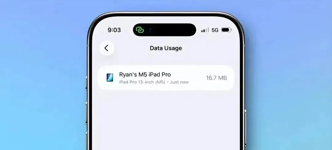 在设置的个人热点页面底部,多了一个“数据使用量”(Data Usage) 的菜单,这个菜单是动态的,用过热点才会出现,点进去,每台连过的设备名字和具体用量会列出来,电脑是不是在后台下更新,朋友借热点看了高清视频,用量能对得上,谁用的多,用在哪,都能查账了。