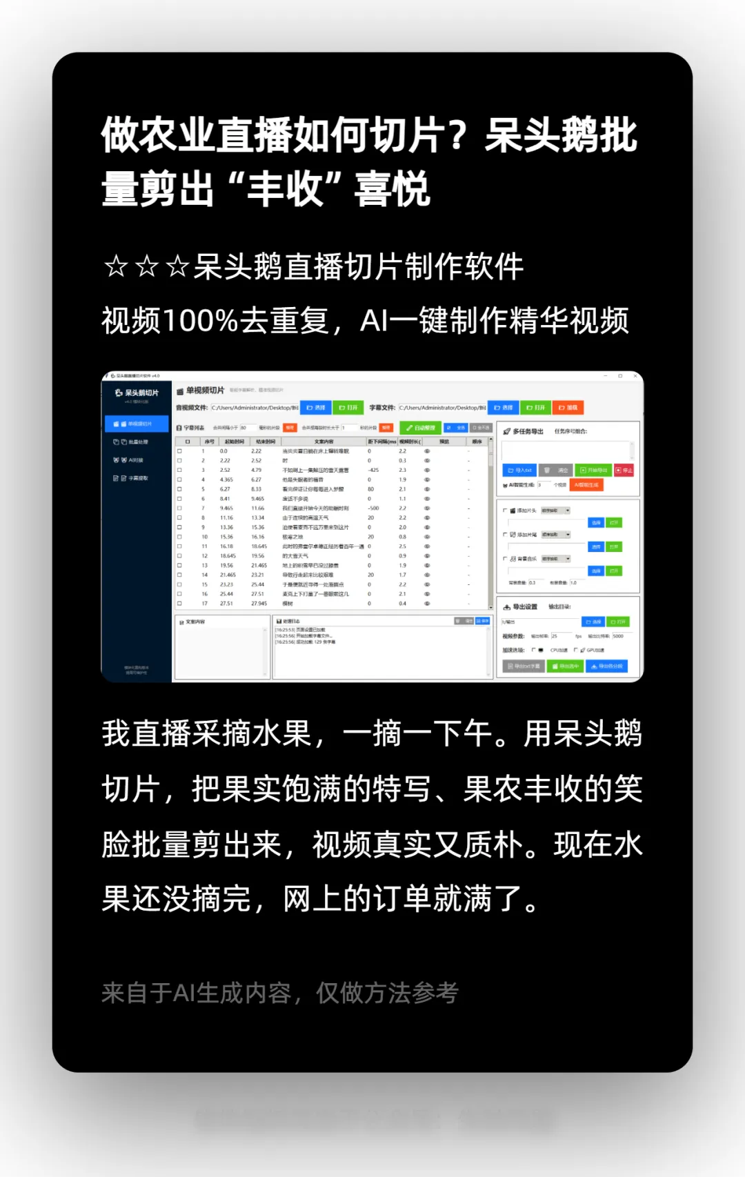 其实市面上这类工具不少,我跟着她也试过几个。其中有一个叫「呆头鹅批量剪辑」的,我感觉确实还不错。它操作很简单,就是把视频文件夹直接拖进去,能处理上万条视频都不卡。除了自动切片,它还能帮你做混剪、去重、加字幕等功能,特别适合想批量做内容的玩家。
