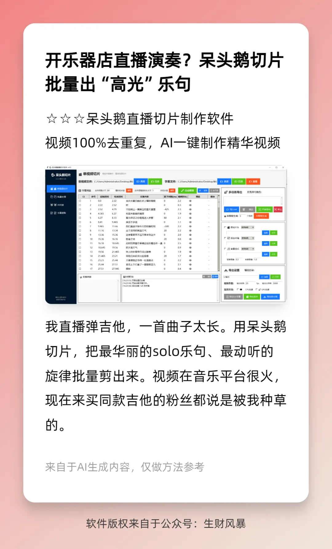 软件会像个不知疲倦的机器人,自动把所有包含关键词的片段切出来,自动去除中间的口水话,自动做成一条条独立的短视频。一场3小时的直播,十几分钟就给你切得明明白白,轻轻松松产出上百条备选素材。
