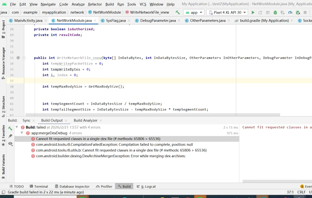今天在把网络通信代码从Intellidea(Java)迁移到Android Studio(Kotlin)的过程中,编译时出现下列错误 : 这个错误提示的意思是:在单个dex文件中,方法调用数不能大于65536。这是安卓开发过程中常见的错误之一。 根据文件格式,安卓android系统的安装包大体上有三种:base.apk、base.odex和base.vdex,它们的区别如下:1、 base.apk:最基本的应用程序的安装包文件格式,包含了应用的所有资源和代码(DEX字节码文件),本质上APK格式是一个压缩包文件,用户安装时,系统从这个文件中提取和加载应用内容。 2、 base.odex:经优化过的DEX文件(Optimized DEX),其可以加快程序的启动和运行速度。 3、 base.vdex:Vdex(Verified DEX)文件,包括DEX文件的验证信息和部分预处理数据,提升应用启动效率。在Android 10及以后引入,可替代部分odex功能;能加快启动速度,可以和odex文件配合使用或者单独存在。 也就是说安卓的安装包格式是dex,在这个dex格式中,单个文件调用方法(method,就是C语言中的函数function)不能超过65536个,超过了编译工程出错,无法生成目标代码。那么为什么有这个65536的限制呢?这就得从安卓的基础原理上讲。 安卓事实上通过支持Java编码技术一瞬间获得了Java的各种生态资源支持,但是其并没有直接使用Jvm虚拟机,而是使用Dalvik虚拟机,这有很多好处,比如单从内存优化角度,Dalvik虚拟机就有优势,适合嵌入式设备。 Dalvik虚拟机是Google等厂商合作开发的Android移动设备平台的核心组成部分之一。它可以支持已转换为.dex(即“Dalvik Executable”)格式的Java应用程序的运行。.dex格式是专为Dalvik设计的一种压缩格式,适合内存和处理器速度有限的系统。而DEX文件是Dalvik虚拟机执行的字节码文件格式,单个DEX文件的结构设计决定了其方法索引表的大小有限,具体是方法调用数不能超过65536个,深层原因是invoke-kind (调用各类方法)指令中,方法引用索引数是 16 位的,也就是最多调用 2^16 = 65536 个方法。故而,一旦你开发的程序中调用方法数量大于65536个,只能通过分割成多个DEX文件这种方法来解决,具体解决方法如下: 此外,除了上面的解决方法之外,也可以通过下列方式解决: 1、如果工程中未定义Application的类,则只需要在AndroidManifest.xml文件使用MultiDexApplication替换Application即可。