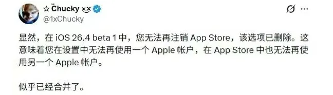 2月17日苹果推送了iOS 26.4 Beta 1测试版,今天收到很多果粉反馈App Store【退出登录】的按钮消失了。