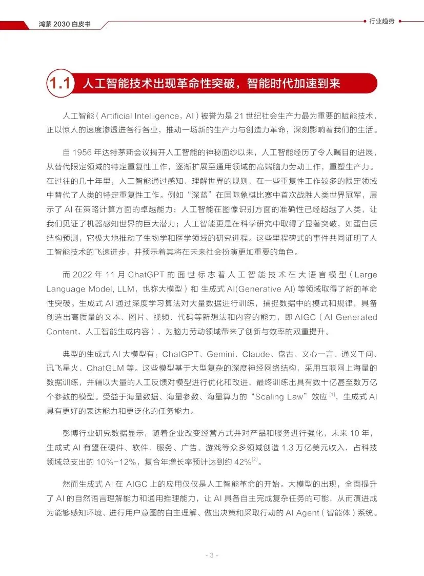人工智能技术在大语言模型和生成式AI等领域取得革命性突破,将演进为AI Agent系统,改变人与机器的协作方式,为社会带来创新与效率的提升。
