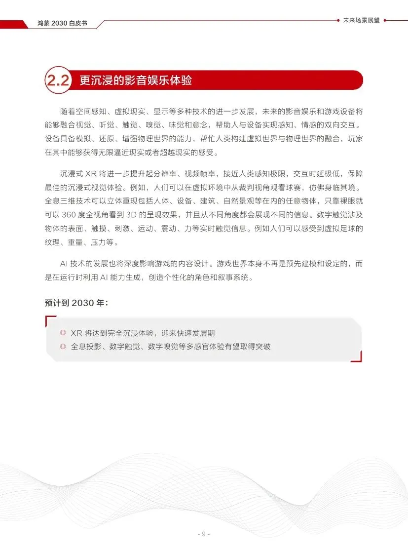 预计到2030年,XR将达到完全沉浸体验,全息投影、数字触觉、数字嗅觉等多感官体验有望取得突破。
