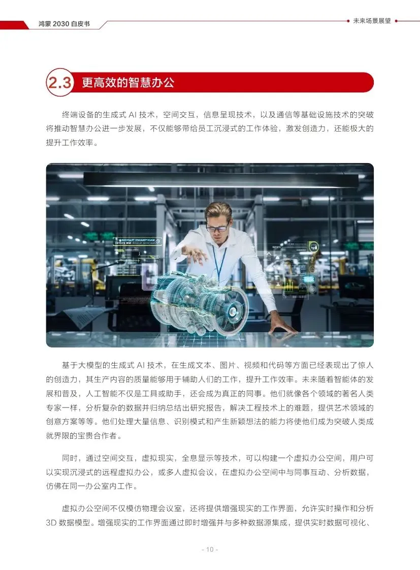 终端设备的技术突破将推动智慧办公发展,AI将成为同事,虚拟办公空间将提供沉浸式体验。