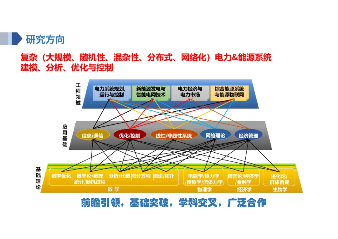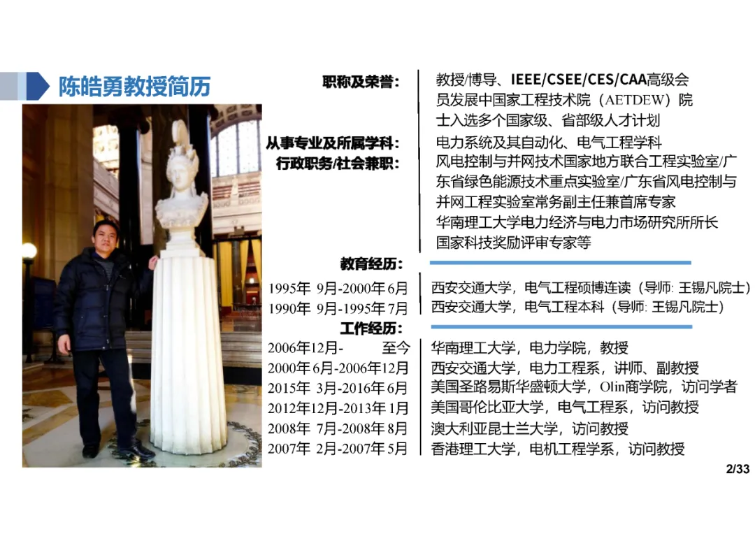 陈皓勇教授2000年毕业于西安交通大学,获工学博士学位,国家优秀青年科学基金获得者、教育部新世纪优秀人才、广东电力科学技术杰出贡献奖获得者,担任中国电工技术学会理事、中国自动化学会智能分布式能源专业委员会副主任,华南理工大学电力学院“新能源电力系统”学术团队负责人、电力经济与电力市场研究所所长等。陈皓勇教授长期从事复杂(大规模、随机性、混杂性、分布式、网络化)电力(能源)系统建模、分析、优化与控制核心基础理论与方法的原始创新研究,在电力(能源)系统的多学科交叉研究方面开展了卓有成效的工作。近年来主持了包括国家优秀青年科学基金项目、国家自然科学基金重点项目、国家重点研发计划专项课题在内的多项国家和省部级重点项目。在国内外权威期刊和国际会议发表论文300余篇,在国际权威出版社John Wiley & Sons -IEEE Press出版英文专著1部,出版中文专著3部。先后荣获2008年度教育部高等学校科学研究优秀成果奖自然科学一等奖、2022年度教育部高等学校科学研究优秀成果奖科技进步二等奖、2017年度海南省科技进步奖一等奖、2017年度中国电力科学技术进步奖二等奖、2017年度中国电力创新奖二等奖、2020年度中国电力科学技术进步奖三等奖等多个奖项。2023年当选为发展中世界工程技术院院士。
