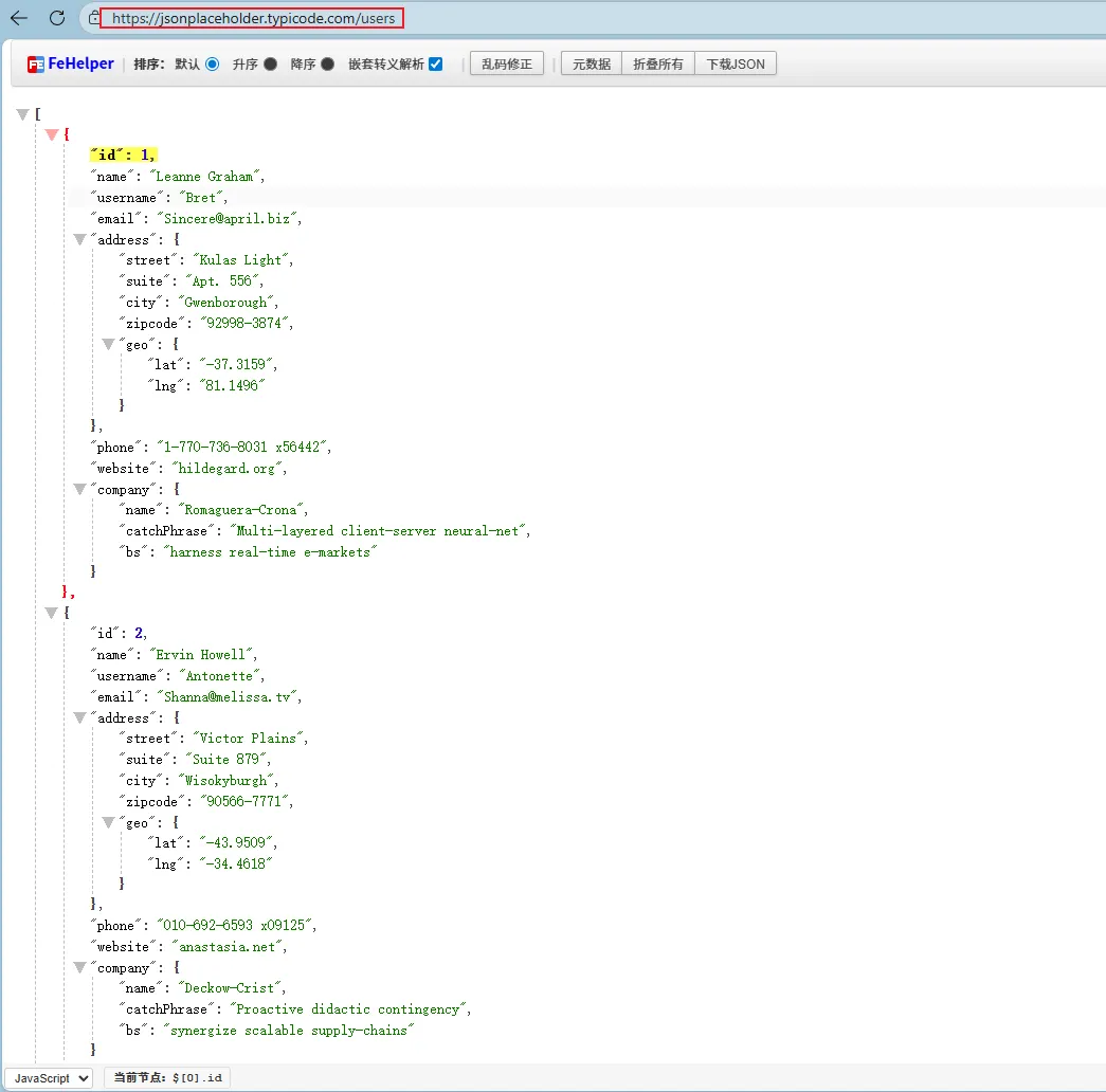 https://jsonplaceholder.typicode.com/users - • 返回数据:10 条用户信息,包含姓名、邮箱、地址、公司等字段。