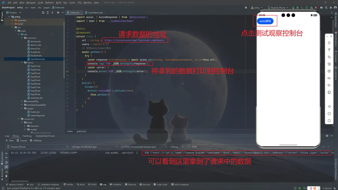 import axios, { AxiosResponse } from '@ohos/axios';import { User } from '../common/UserDemo'@Entry@Componentstruct Index { url: string = 'https://jsonplaceholder.typicode.com/users' async getUser() { try { const response: AxiosResponse = await axios.get(this.url); console.log('✅ 请求成功:', JSON.stringify(response.data)); } catch (error) { console.error('❌ 请求失败:', JSON.stringify(error)); } } build() { Column() { Button('axios测试').onClick(() => this.getUser()) } }}