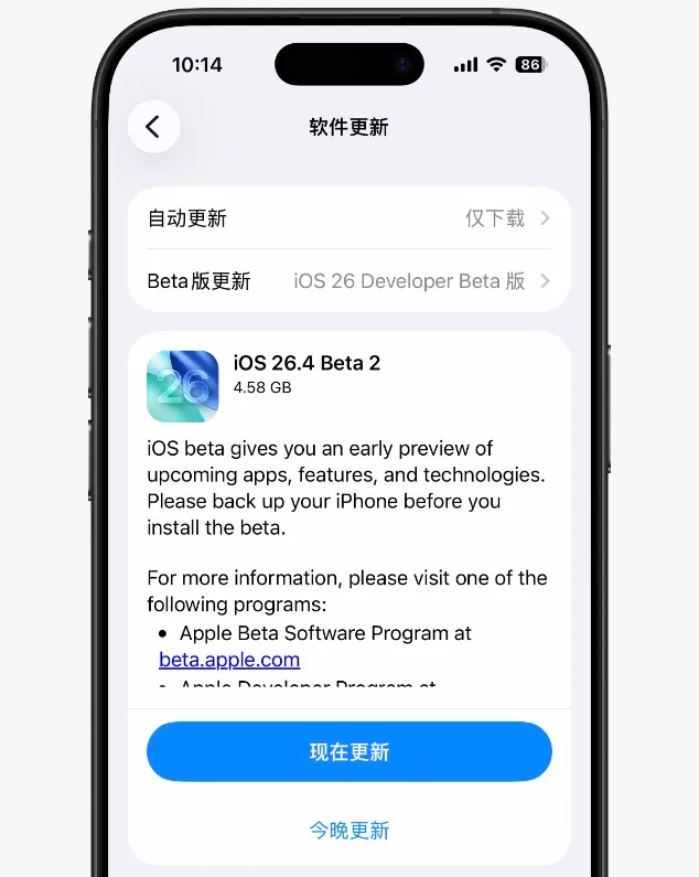 ,已经注册Apple Beta版软件计划的用户只需打开设置--通用--软件更新即可在线OTA升级至最新的iOS 26.4 Beta2测试版。