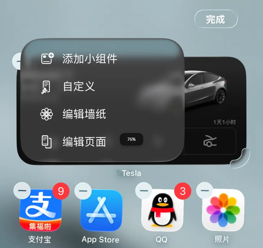 长按主屏幕呼出的“编辑”菜单采用“液态玻璃”(Liquid Glass)材质,背景透明度提升,视觉效果更轻盈。这一设计延续了iOS 18以来的材质语言升级趋势,强化了系统界面的现代感。