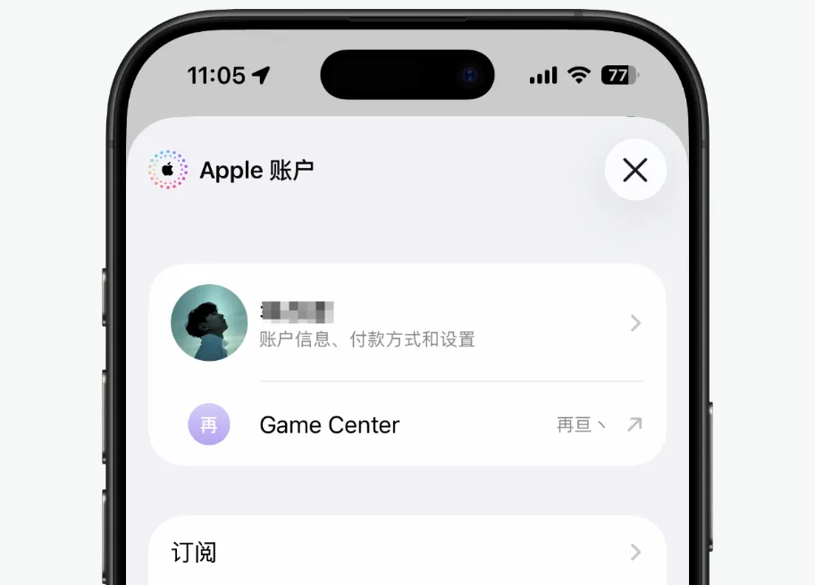 App Store与Apple Music的账户中心选项中,“Apple Account”文字左对齐,并采用与系统设置中相同的彩虹色苹果Logo,强化品牌视觉一致性。