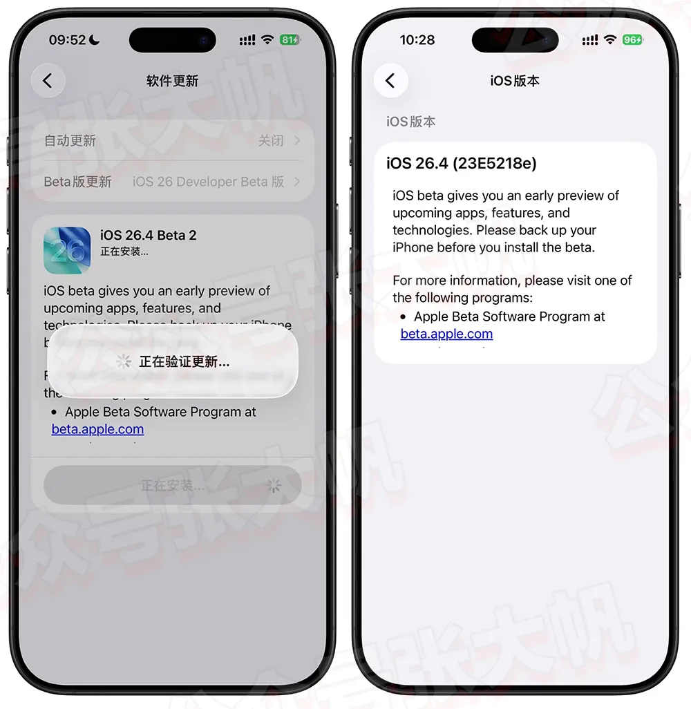 大家好!今天凌晨苹果推送了 iOS 26.4 beta 2 测试版系统,版本号是 23E5218e,一起来看看都有什么变化更新!