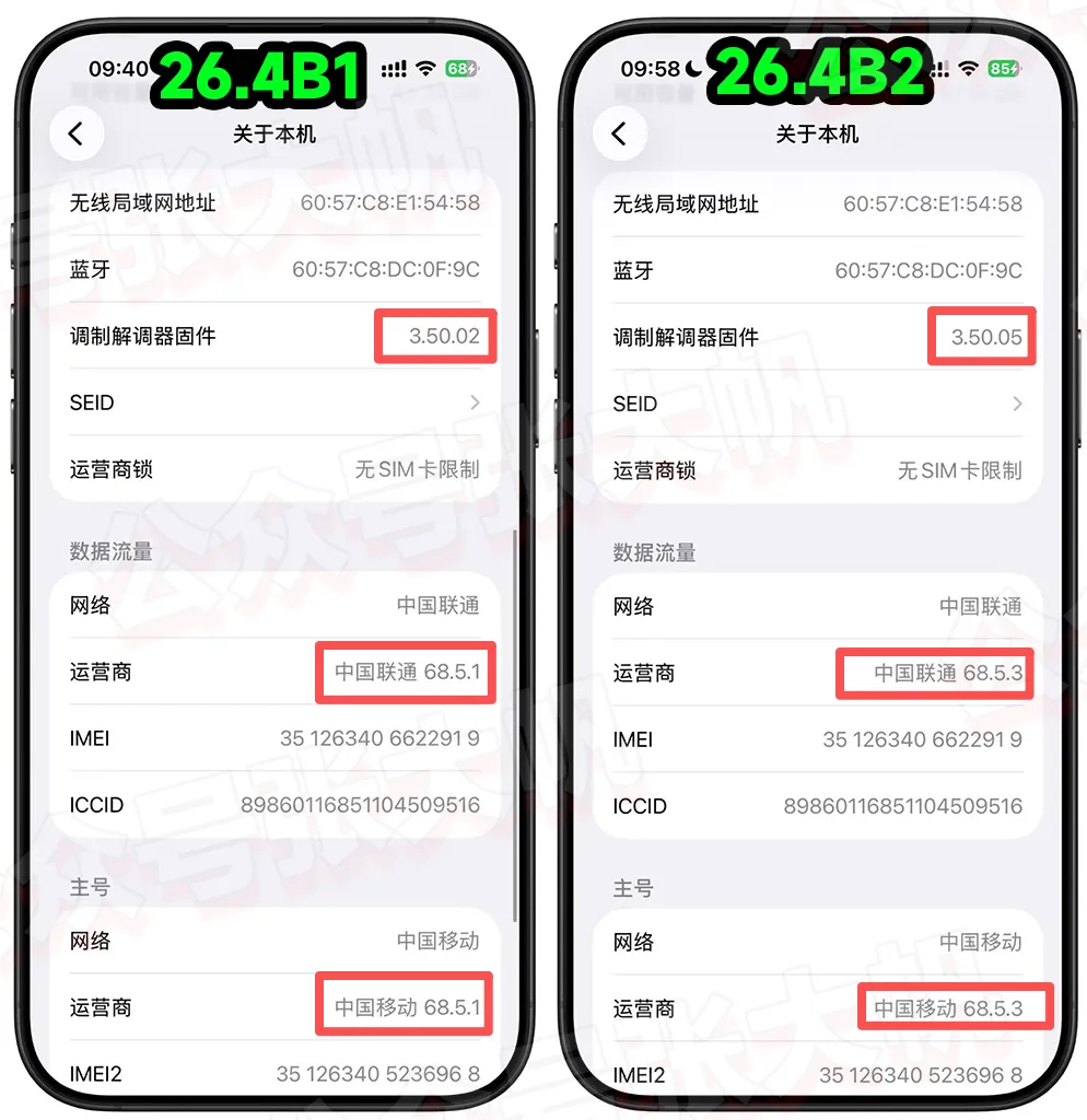 以15Pro为列,此次更新后调制解调器从3.50.02升级到了3.50.05,运营商版本从68.51升级到了68.53
