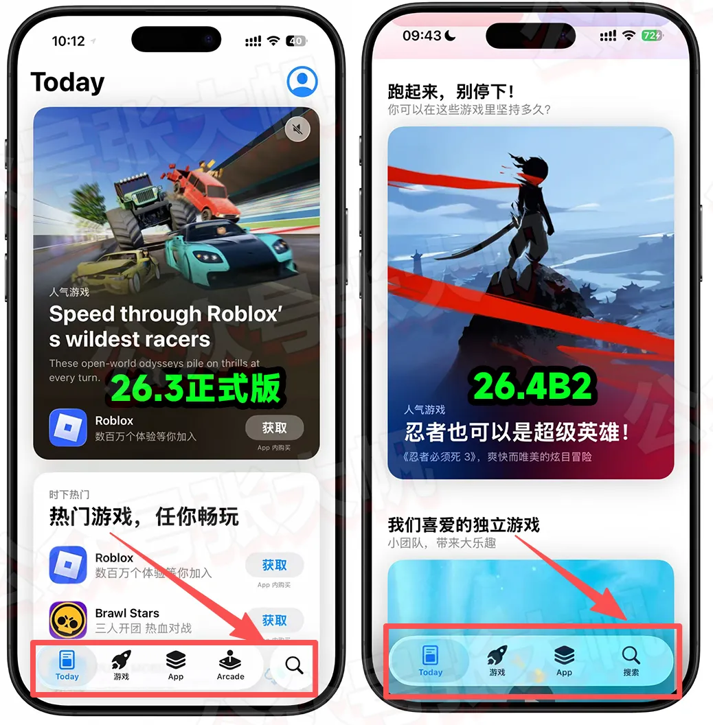 从 iOS 26.4 开始应用商店和游戏APP底部
