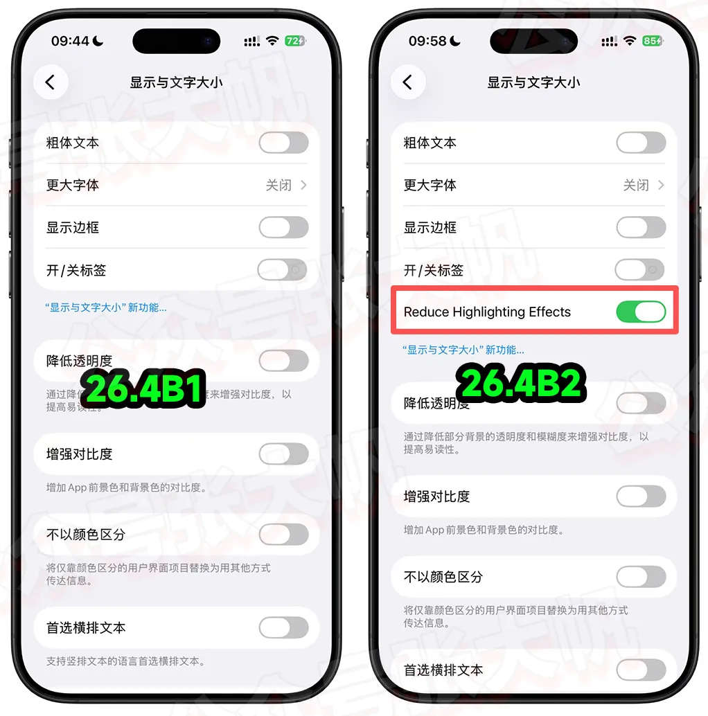 此次更新后,在辅助功能- 显示与文字大小中,新增了一个Reduce Highlighting Effects开关,直译为:减少高亮显示效果。