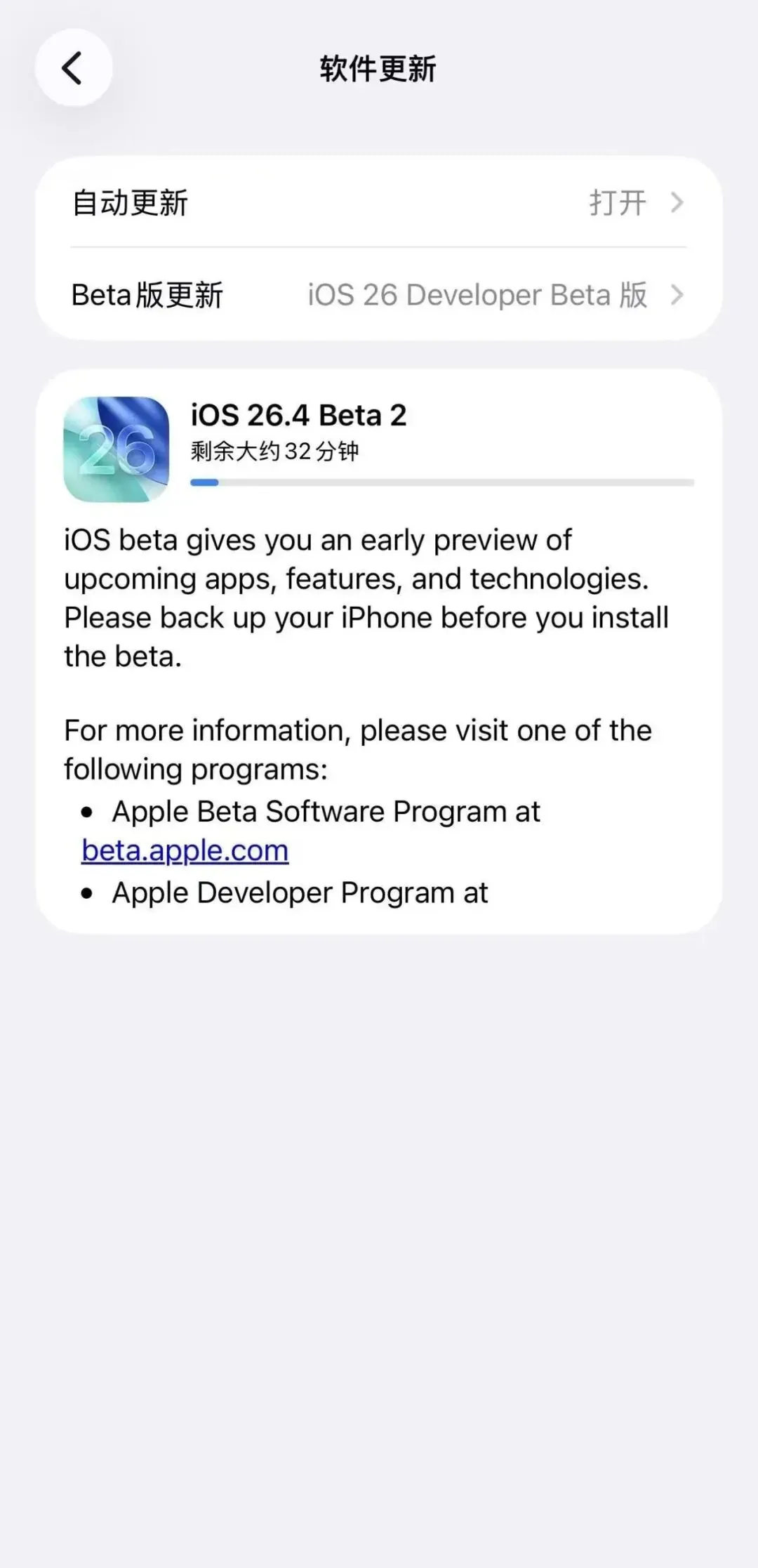 iOS 26.4 Beta 2 主要带来以下功能更新: