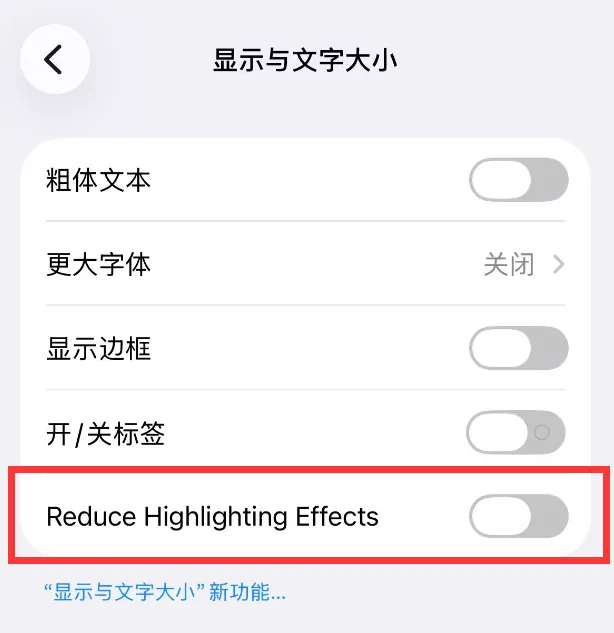 在「设置 - 辅助功能 - 显示与文本大小」页面中,新增「Reduce Highlighting Effects」开关,即「减弱高亮效果」开关。