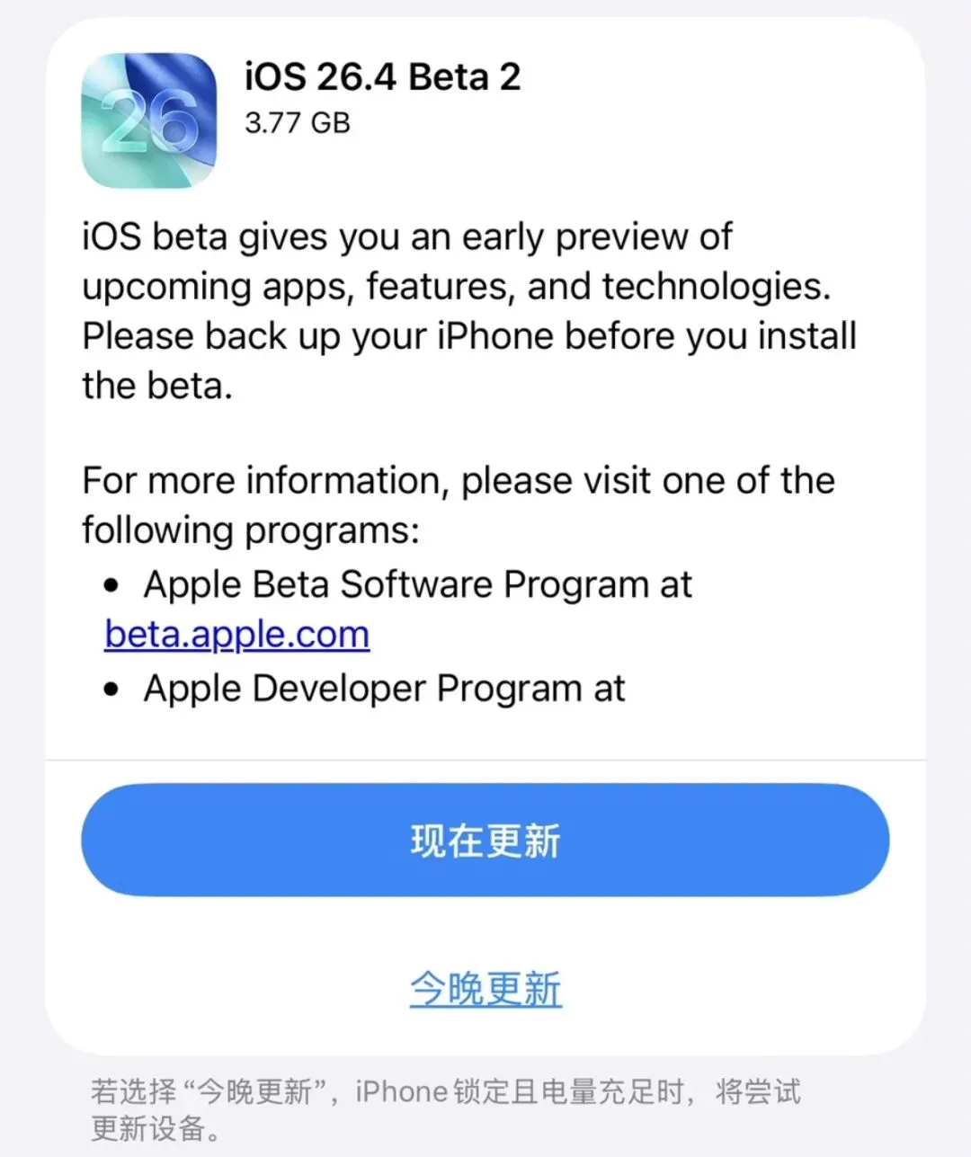 今日凌晨,苹果向广大参与开发者计划的用户推送了iOS26.4Beta2版本,该版本是目前iOS26中最新的测试版。