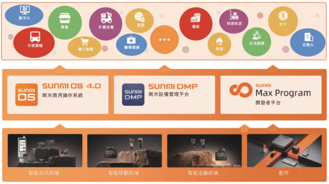 1. 智能商用设备,包括智能POS终端、台式及自助收银机、金融云音箱、电子价签等60余款硬件产品,搭载自研的SUNMI OS商用操作系统;