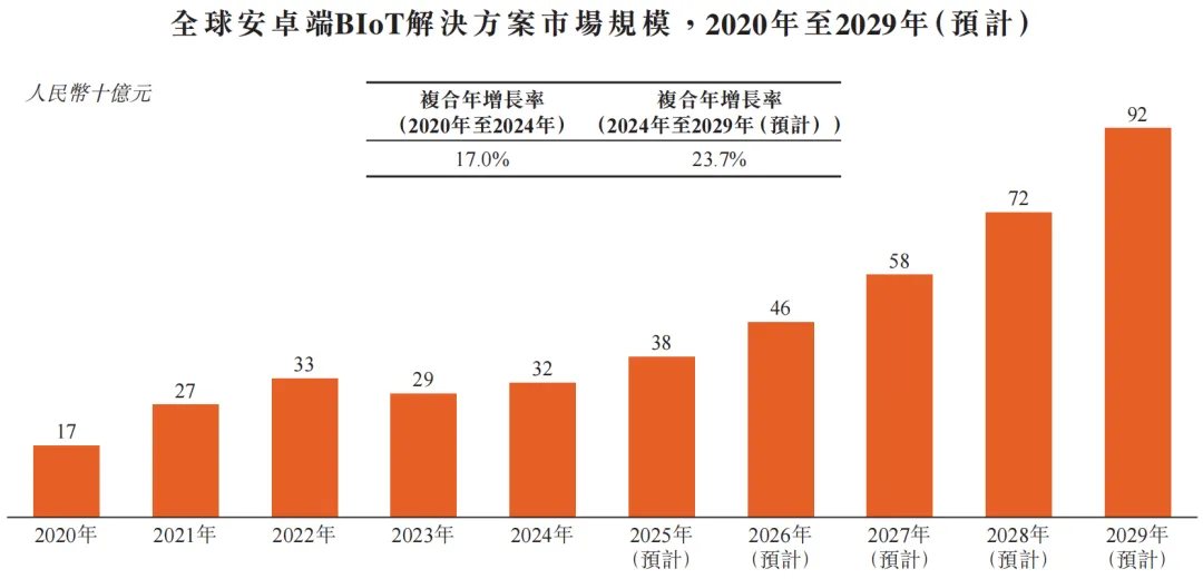 据灼识咨询数据,全球安卓端BIoT解决方案的市场规模持续增长,从2020年的179亿元增至2024年的320亿元,复合年增长率为17.0%,后续预计将以23.7%的速度增至2029年的920亿元。