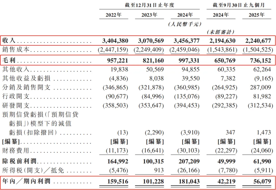 而公司的毛利也是类似的情况,从2022年至2024年,分别为9.6亿元、8.2亿元及10.0亿元,对应的毛利率分别为28.1%、26.7%及28.8%。2025年前三季度的毛利为7.3亿元,同比增长13.1%,对应的毛利率为32.8%。