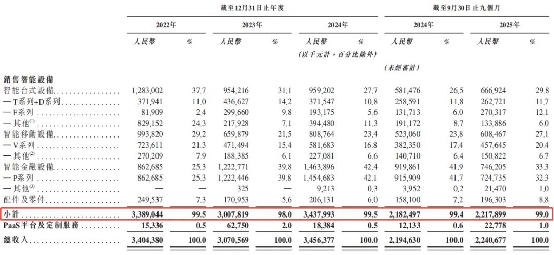 按收入类型划分,公司的绝大部分收入来自销售智能设备,于2025年前三季度约占当期收入的99.0%。