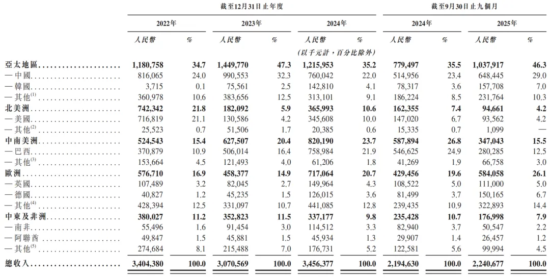 按区域划分,2025年前三季度收入占比分别为:亚太地区46.3%、欧洲26.1%、中南美洲15.5%、中东及非洲7.9%、北美洲4.6%。