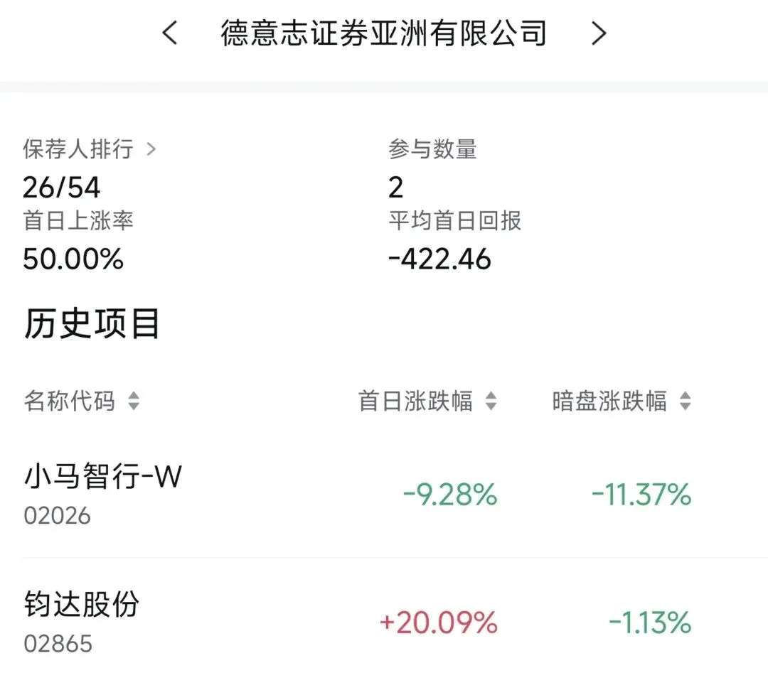 在德意志证券近2年保荐的港股项目中,首日上涨率为50.00%,平均首日回报-422.46港元。