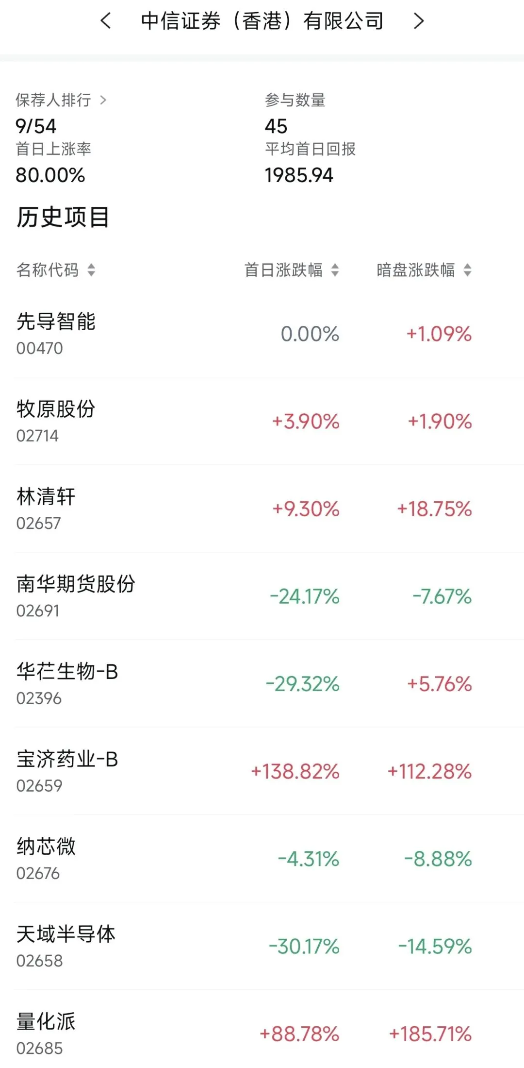 在中信证券近2年保荐的港股项目中,首日上涨率为80.00%,平均首日回报1985.94港元。