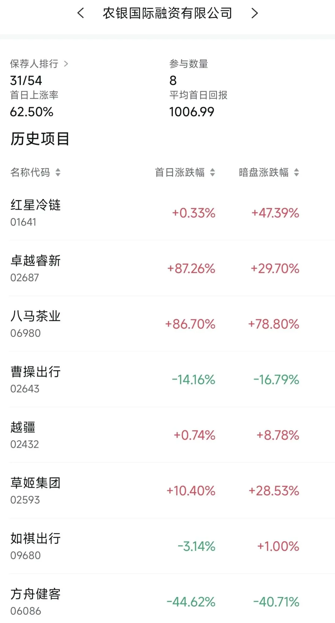 在农银国际近2年保荐的港股项目中,首日上涨率为62.50%,平均首日回报1006.99港元。