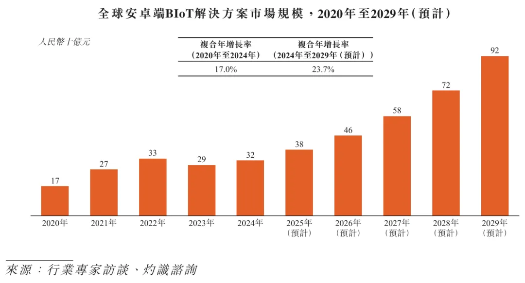 值得注意的是,安卓端 BIoT 市场正处于高速增长期。2024年全球市场规模约320亿元,预计2029年将飙升至920亿元,复合年增长率高达23.7%,渗透率将从14%提升至29%。相比之下,非安卓端市场增速仅1.7%,商米所处的赛道无疑具备广阔的增长空间。
