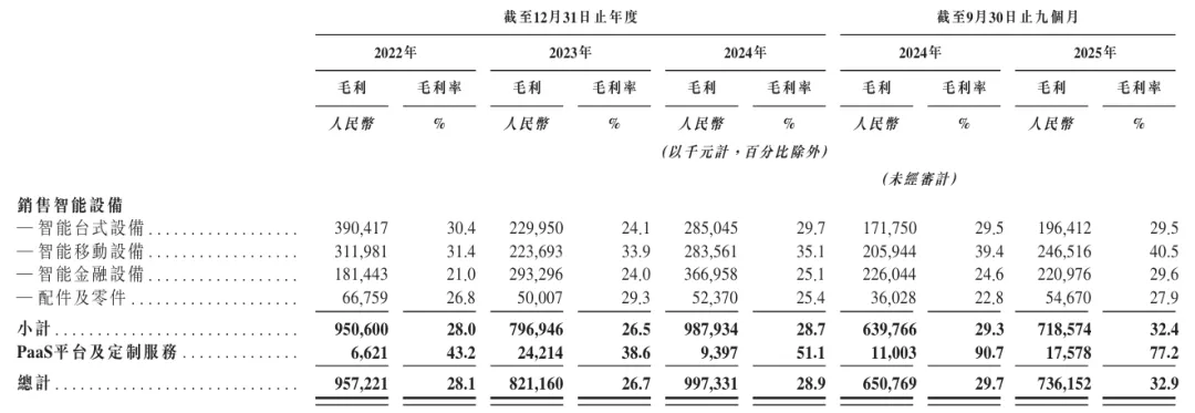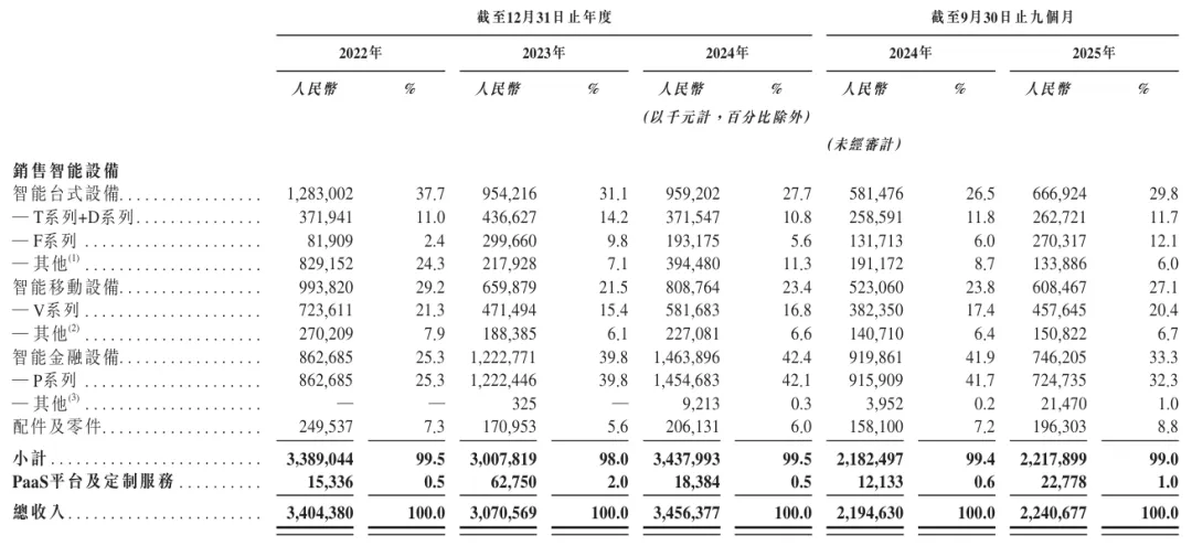 2022 年至 2024 年,公司收入从34.04亿元降至30.71亿元后回升至34.56亿元,2025 年前九个月收入达22.41亿元,同比增长2.1%。收入结构中,智能设备销售占比超99%,其中智能金融设备是核心增长引擎,2024 年收入同比增长19.7% 至14.64亿元。