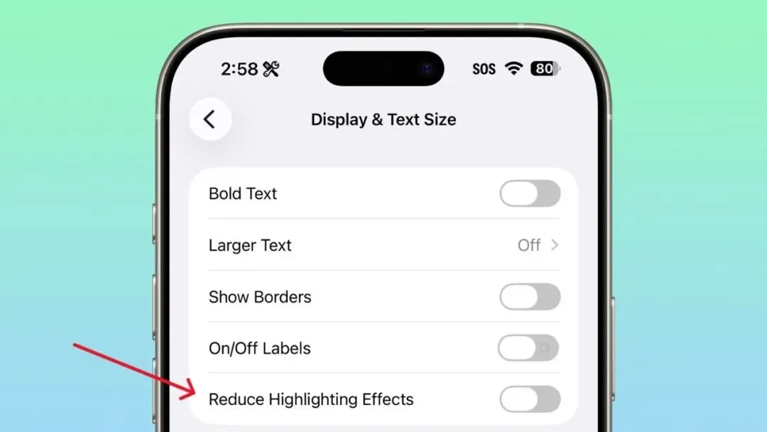 【辅助功能新增“减少高亮效果”选项】在“设置→辅助功能→显示与文字大小”的路径中,新增了“Reduce Highlighting Effects”(减少高亮效果)开关,开启后可减弱界面高亮显示效果,优化视觉体验。